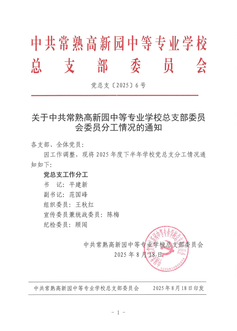 关于常熟高新园中等专业学校党总支委员会委员分工情况的通知